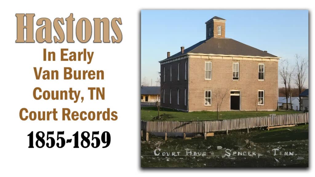 Hastons in Court – The Good, The Bad, and the Ugly 139 Entries Links will be activated when the posts have been published. 1840-1844 1845-1849 1850-54 1855-1859 1860-1866 (From TSLA – Van Buren County, TN MF Roll #14) Year of 1840 Page Name Summary 1 Isham B. Haston He was one of the original JusticesContinue