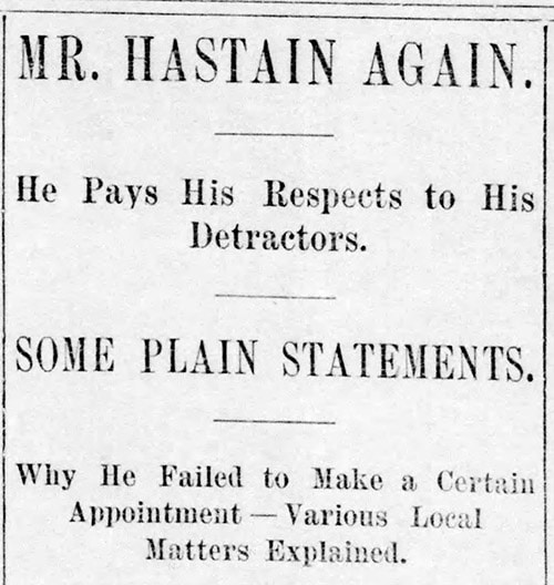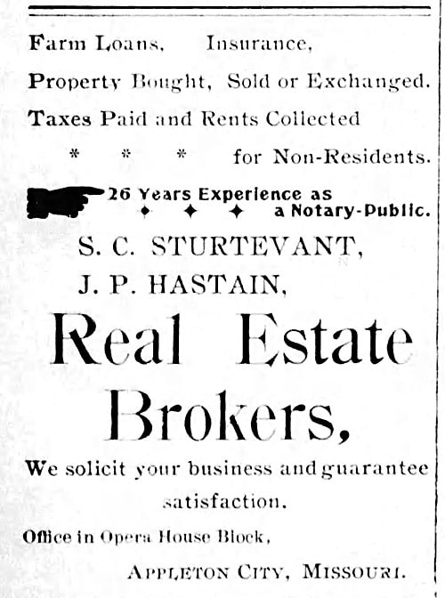J.P. (James Preston) Hastain, the son of Daniel McComisky Haston/Hastain, and his business partner, ran this newspaper ad throughout the year 1895. Appleton, MO was in St. Clair County.