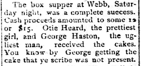 Box (or pie) suppers used to be money-raising events, where girls made pies and cakes, etc., and boys bid on them, which came with the opportunity to eat with the girl. Sometimes the pie, cake, or whatever was hidden inside a box, thus the term “box” supper. I’ve been there, done that! George Haston was voted the “Ugliest Man,” which doesn’t mean he was actually the ugliest. It was good entertainment, especially in the years before TV and internet.