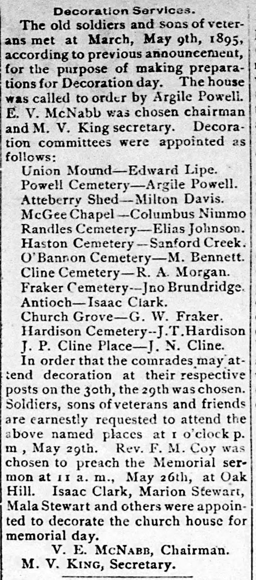 Buffalo (MO) Reflex: As happened in May 1891, the Haston Cemetery was mentioned and Sanford Creek was appointed to clean and decorate it. This annual event indicates that there was at least one Civil War veteran buried in the cemetery. As of now (8-4-2025), the location of Haston Cemetery is unknown to the Dallas County Historical Society. I have evidence that suggests it was on the property of Jeremiah Haston or one of his children, north of Charity, MO in the Jackson Township.