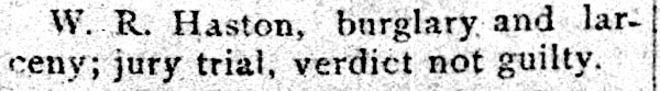 Buffalo (MO) Reflex: William Riley Haston and a friend were arrested for burglary in December of 1893. Nearly two years later, W.R. was declared “not guilty.”