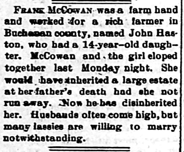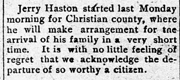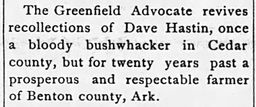 The Clinton (MO) Eye: Dave Hastin, who was once a “bloody bushwhacker”in Cedar County, MO returned to his home county after being away for 20 years. He was a Confederate soldier in the Civil War and moved to Texas, then Arkansas, after the war, probably to escape revenge from some of his Union neighbors. He was a grandson of Isaac Haston, who moved to California before the war. Apparently, his war activities were remembered 20 years later.