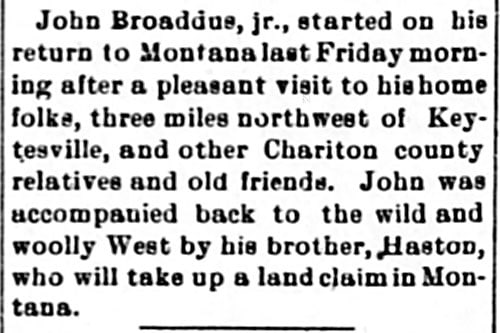 Chariton (MO) Courier: The daughter of Jesse Haston, Sr., Elizabeth (Bettie) V. Haston, married John A. Broaddus (Sr.) in Glasgow, MO on September 22, 1859. John died in 1897, and Elizabeth went to southeastern Montana to live on a ranch with her son John, Jr. Haston Broaddus was one of John and Bettie’s sons. There were twelve children in all. The oldest son was Oscar. The town of Broaddus, MT was named for her sons.