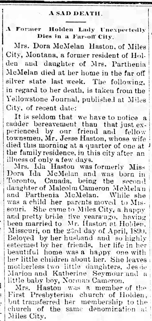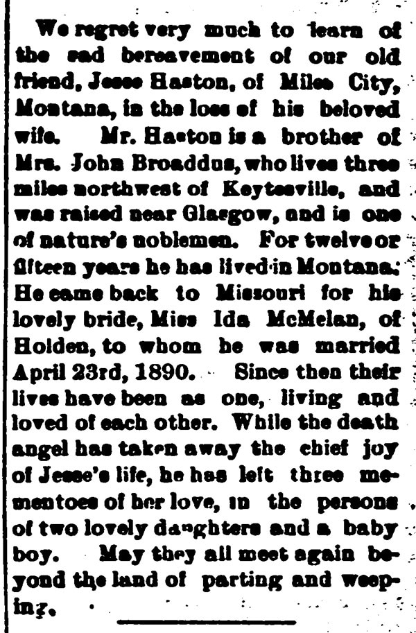 After only barely five years of marriage, the wife (Ida McMelan) of Jesse Haston, Jr. (grandson of Daniel Haston), passed away. She left behind three daughters and a baby boy.