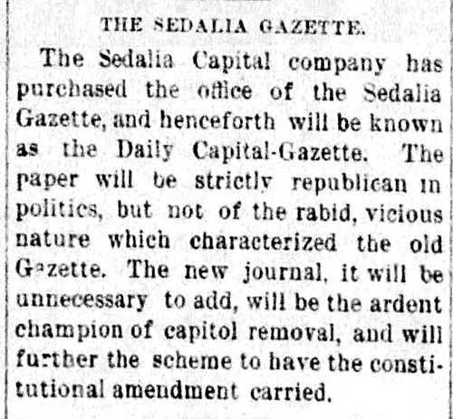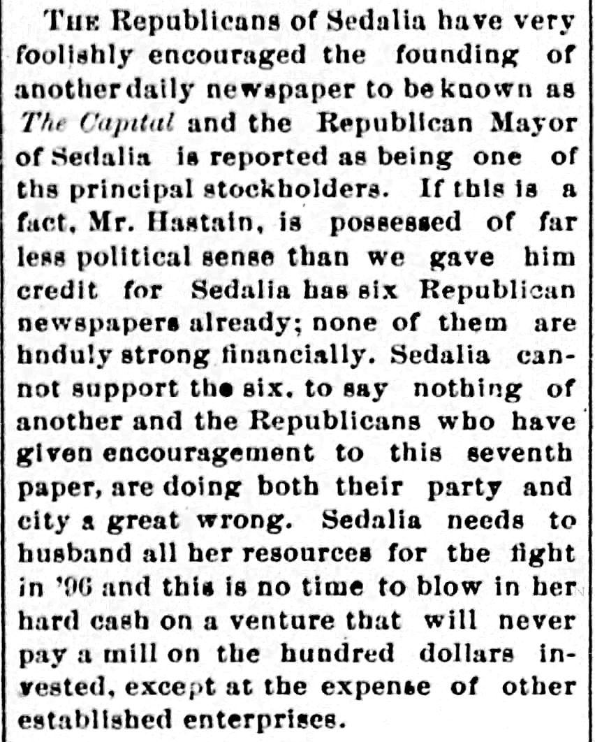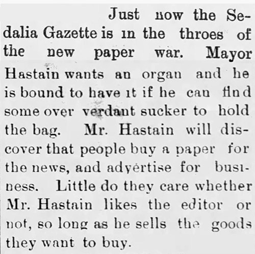 The Standard Herald: Apparently, Mayor P.D. Hastain of Sedalia, MO wanted a local paper that was supportive of his Republican agenda, especially at the time he was working to move the Missouri capital from Jefferson City, MO to Sedalia, where he was the mayor.