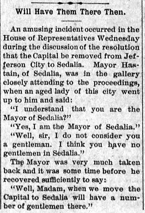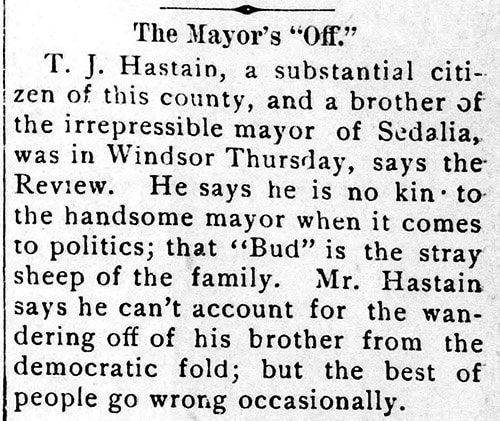 The Sedalia (MO) Democrat: Mayor P.D. Hastain’s brother, Thomas Jefferson Hastain, said that his brother (the mayor) is the stray sheep (politically) of the family.