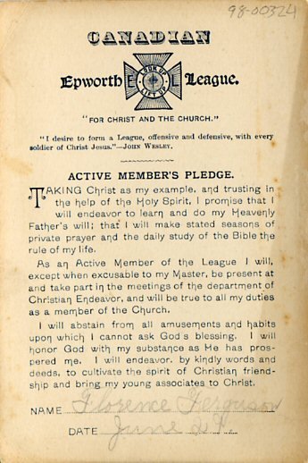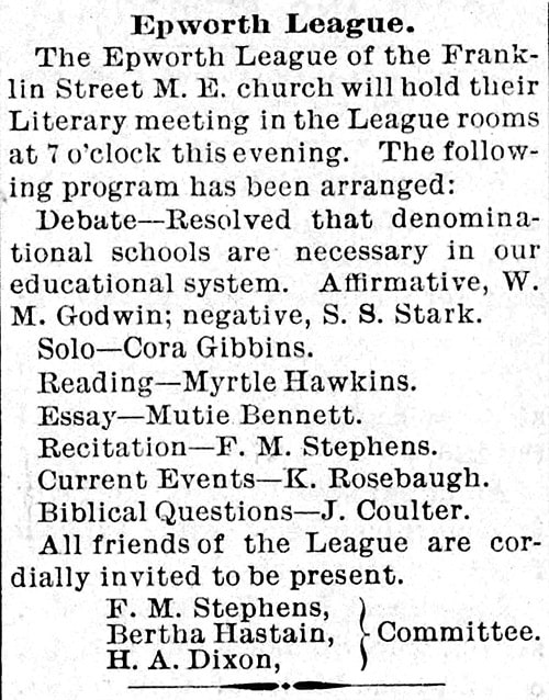 The Clinton (MO) Daily Democrat: Bertha May Hastain (born 1875) was the daughter of Woodson Asbury Hastain and Sarah Jane Walker Hastain, and granddaughter of Daniel McComisky Hastain and Anna N. Greene Hastain. She married Joseph Shelby McCuan in 1895. She apparently was a leader in the Epworh League, a Methodist young adult association fo rpeople aged 1835.