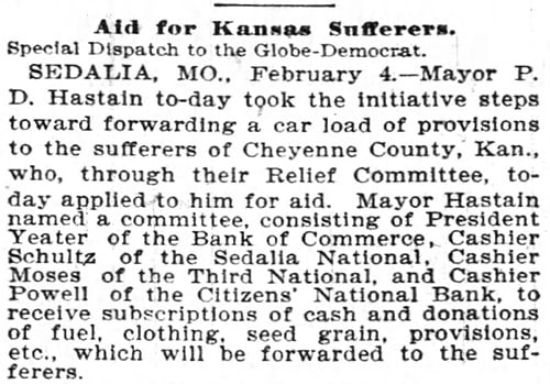 St. Louis Globe-Democrat: In the previous months, Cheyenne County, Kansas, had suffered because of a drought and grasshopper invasion. Mayor Pleasant Dawson Hastain, led in a relief effort to provide assistance to the county.