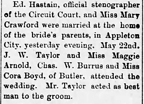 The Butler (MO) Weekly Times: Ed Hastain, the stenographer of the Circuit Court of Butler, MO, was married to Miss Mary Crawford in Appleton City, MO. Edwin Hastain was the son of James Preston Hastain and Octavia Hinckle Hastain of Henry County, MO. The Wedding
