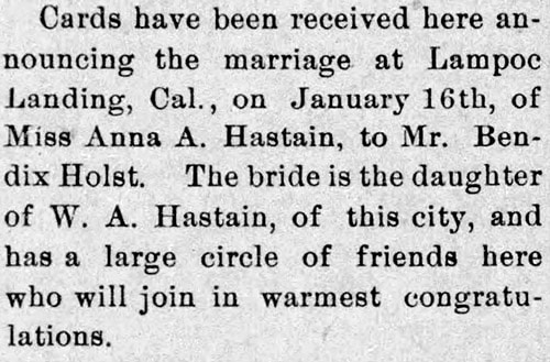 The Clinton (MO) Daily Democrat: The marriage of Anna A. Hastain, daughter of W.A. Hastain, to Bendix Holst was announced. W.A. Hastain was the son of Daniel McComisky Haston/Hastain.
