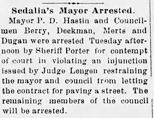 The Sedalia (MO) Democrat: Mayor P.D. Hastain was a controversial man, especially as a politician and mayor. Apparently, you either hated him or respected him. I doubt that many loved or liked him as a person. It appears that he made decisions that drew the ire of people in Sedalia, MO.