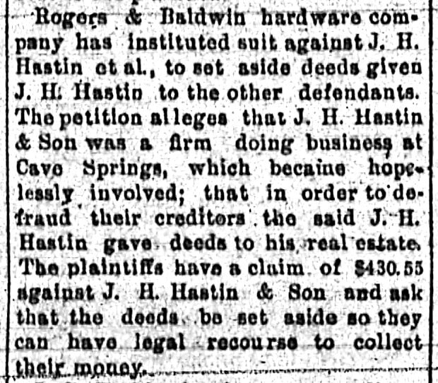 The Springfield News-Leader: J.H. Hastin and Son was a firm doing business at Cave Springs in Greene County, MO (the community where Isaac settled in the late 1830s. Apparently, they were in debt and their deeds were collateral for the debt.