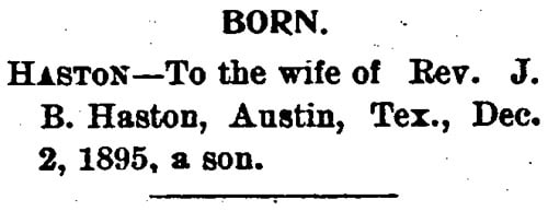 Weekly Graphic (Kirksville, MO): Rev. Jesse Bascom Haston and his wife, Coramantha Baldwin Haston, experienced the death of their (approximately) one-year-old daughter, Helen Washington Haston, in April of 1893. Now, they had a baby boy!