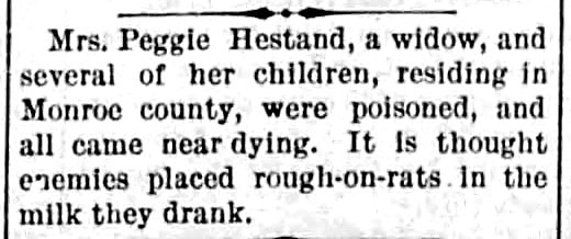 The Paducah Sun: This lady’s husband would have been a descendant of Abraham Hiestand/Hestand, Daniel Haston’s older brother. The family lived in Monroe County, KY, south-central KY. What would she have done to have caused someone to poison her entire family?