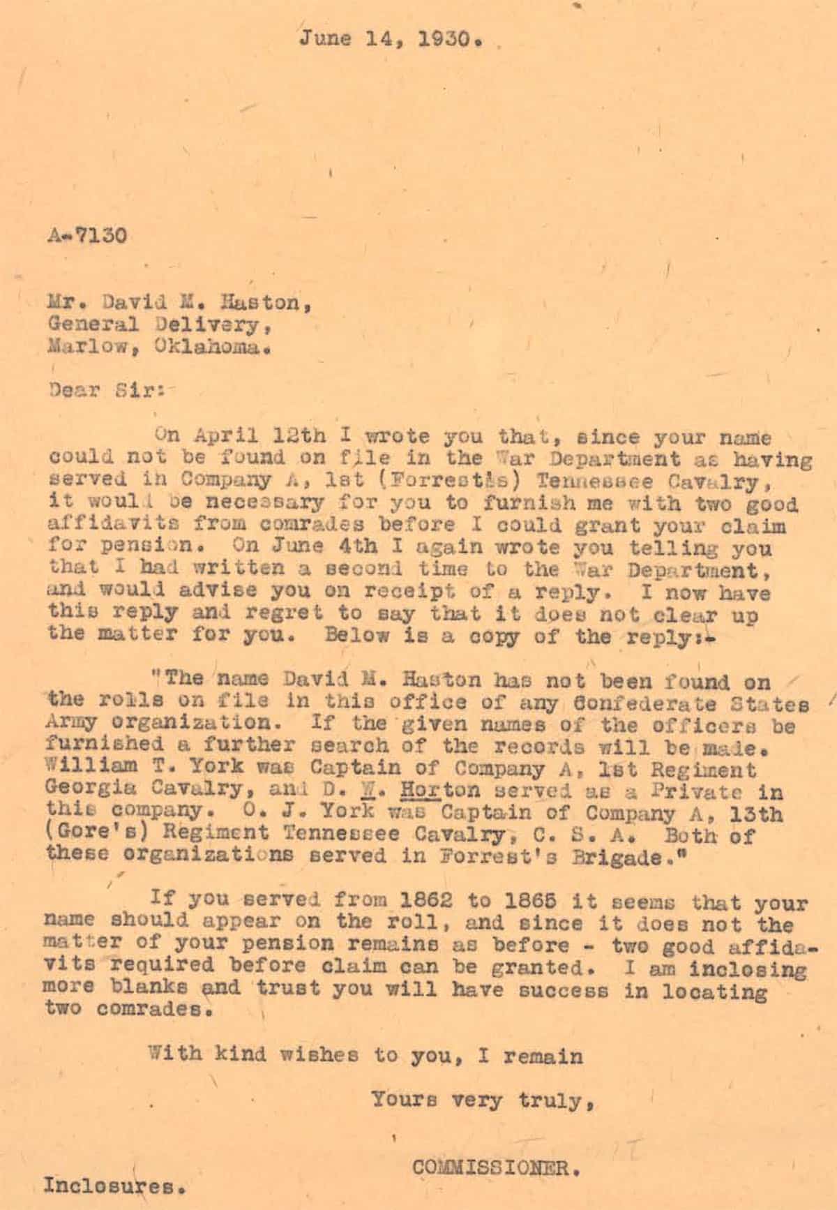 At the age of 84 and living in Marlow, OK, David Montgomery Haston file an application for a pension, 65 years after the war ended and he was discharged. Â