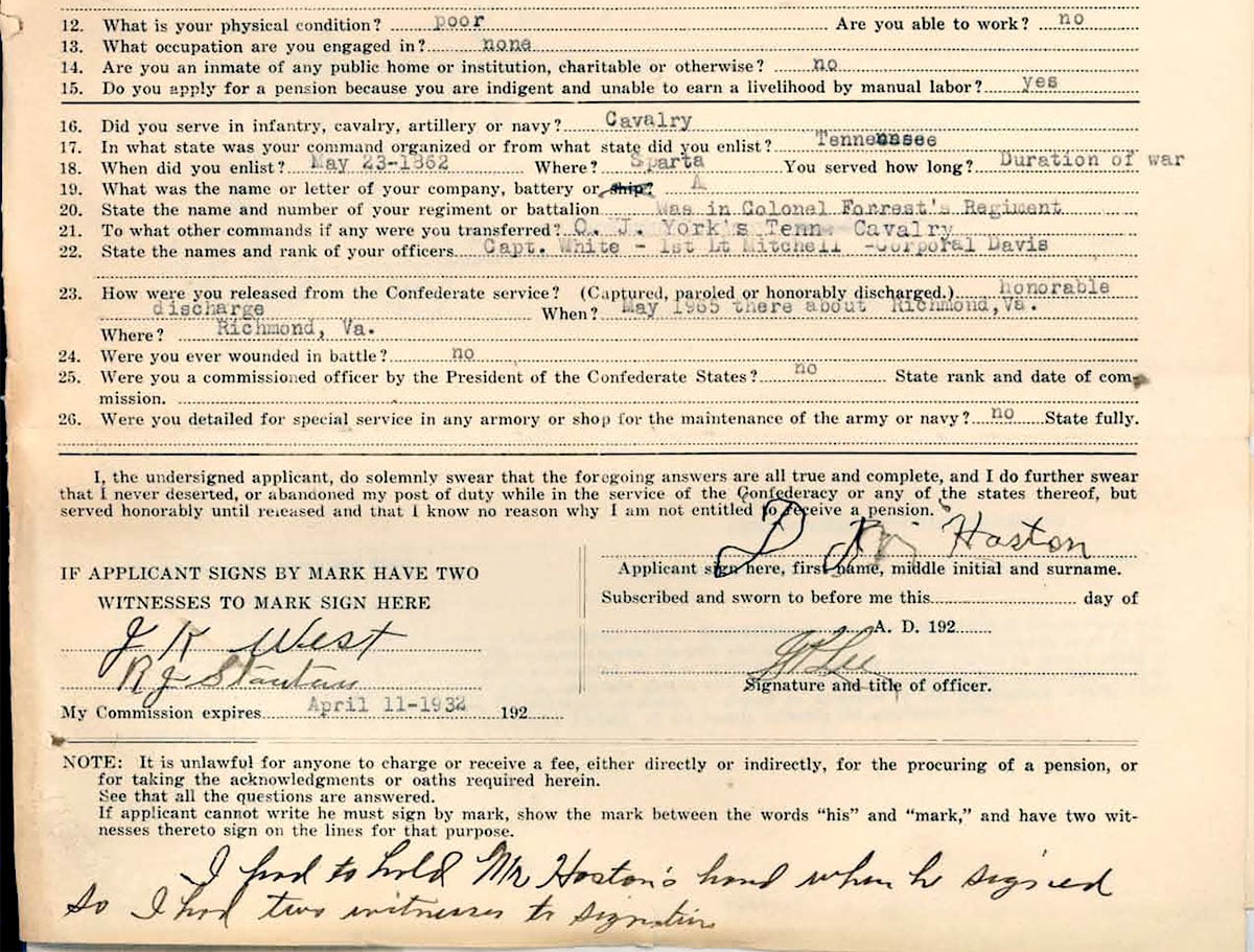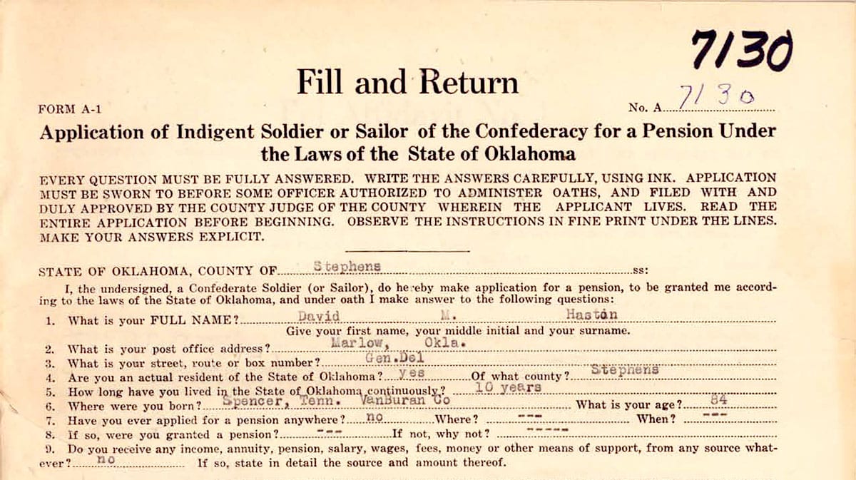 In 1915, the Oklahoma Legislature approved the Confederate Soldiers’ Pension Bill. The Board of Pension Commissioners received applications and allowed, or refused, pensions based on established criteria, including the applicant’s residence in Oklahoma for 12 months prior to the passage and approval of the Act. -Oklahoma Department of Libraries